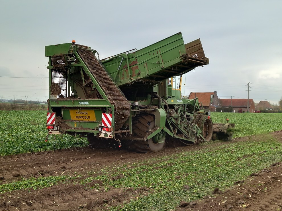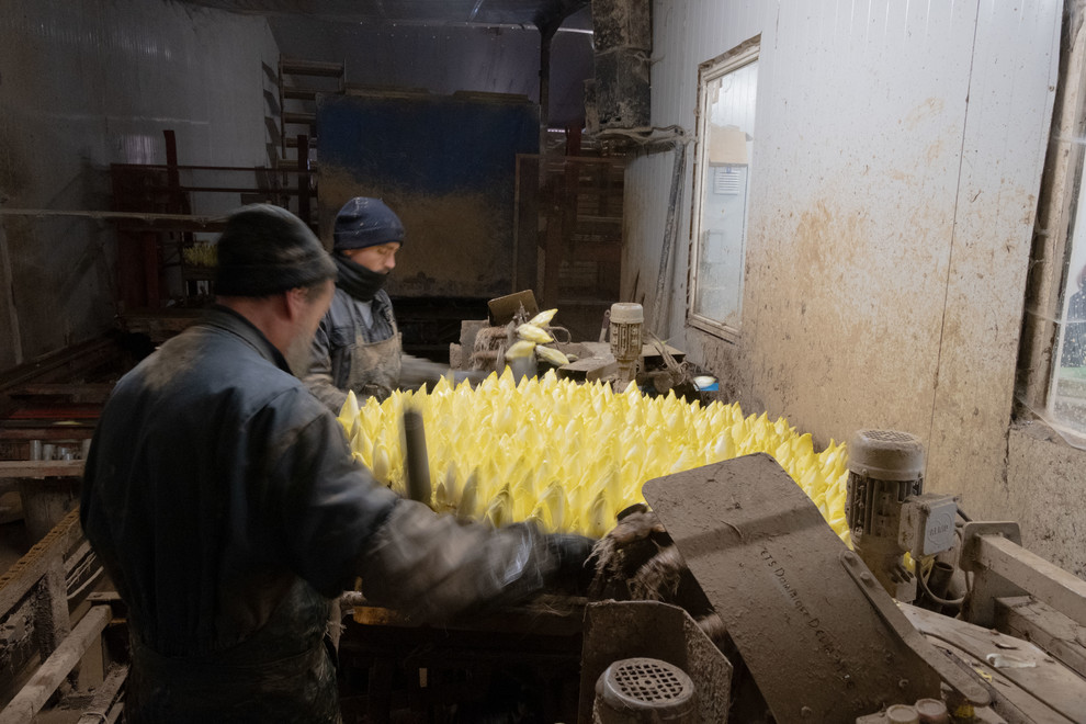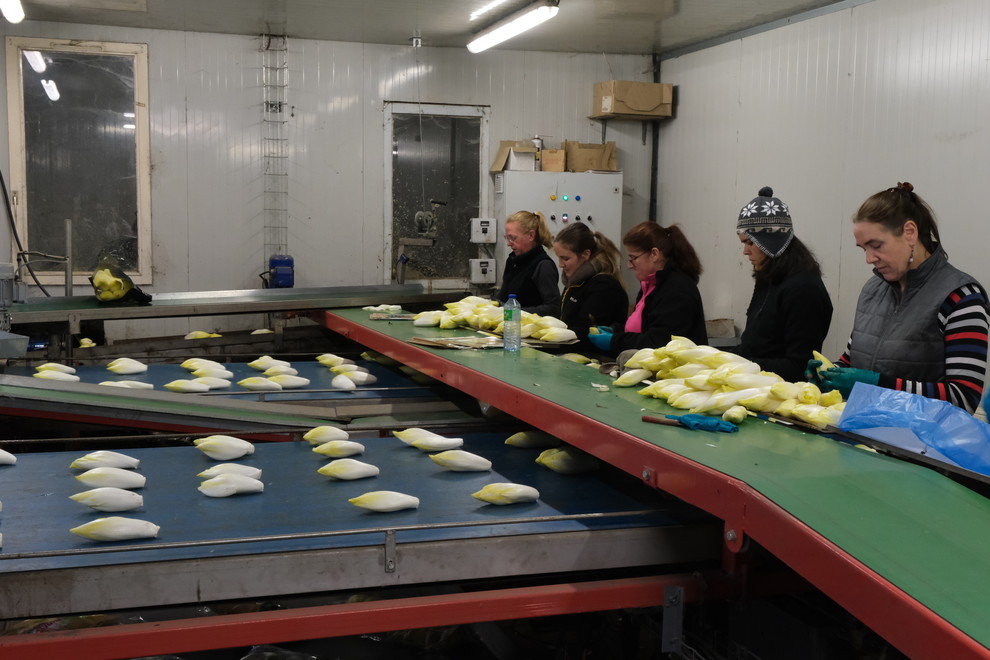 La récolte démarre en novembre et dure en général de trois semaines à un mois. Après avoir été arrachées, les racines vont être calibrées et « déterrées », c’est-à-dire nettoyées de toute trace de terre. Une fois cette étape terminée, elles sont placées dans des boîtes en bois appelées « palox » qui sont entreposées dans un hangar l’espace de quelques jours, le temps que de la place se libère dans les chambres froides. Ces palox sont ensuite transférés dans les chambres froides pour une durée allant de 15 jours pour les endives destinées à être « forcées » tôt, à un an pour celles qui le seront plus tard.